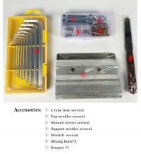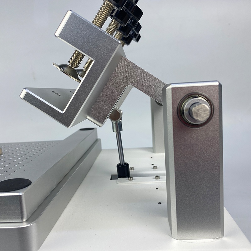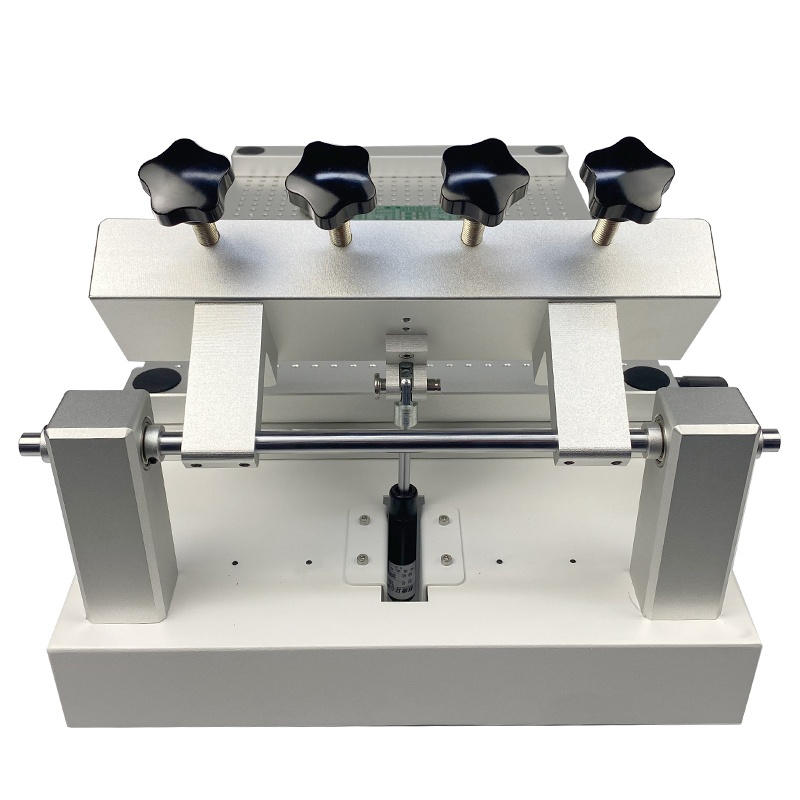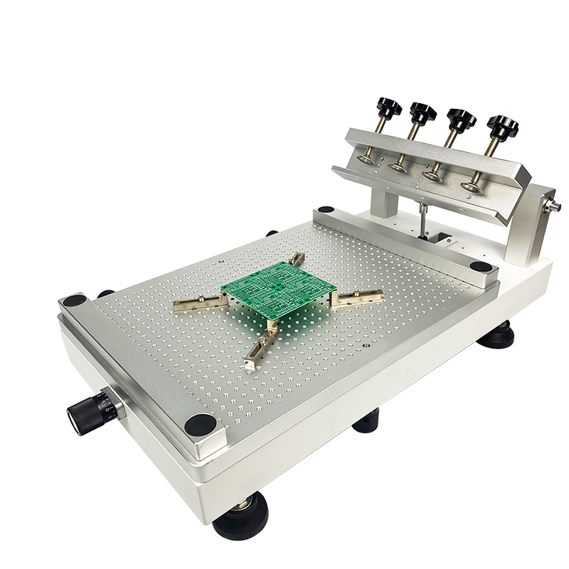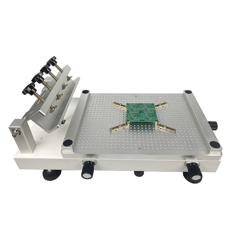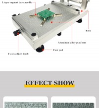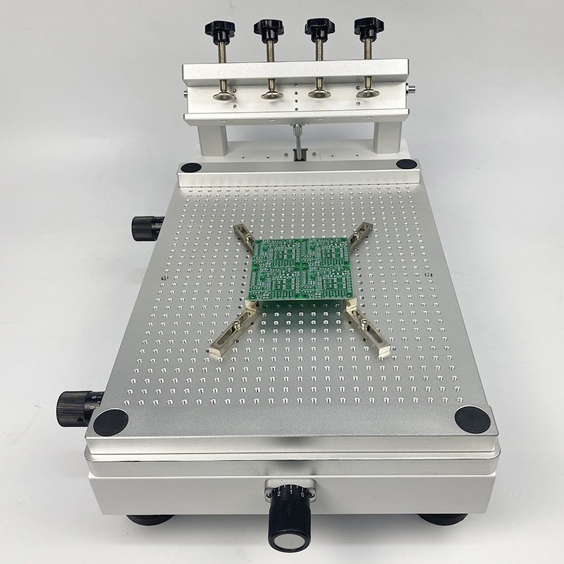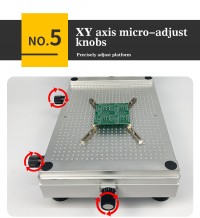 Step 1: remove the printed circuit board and place on the four positioning pin, rotate height adjustment knob to make printing module and circuit board contact, then adjust the positioning needle position, make the printing hole of printing template consistent with printing surface of circuit board , fixed four positioning needle