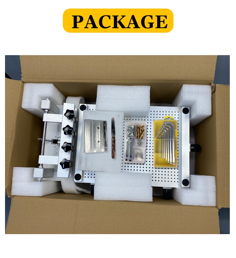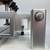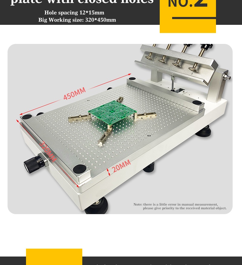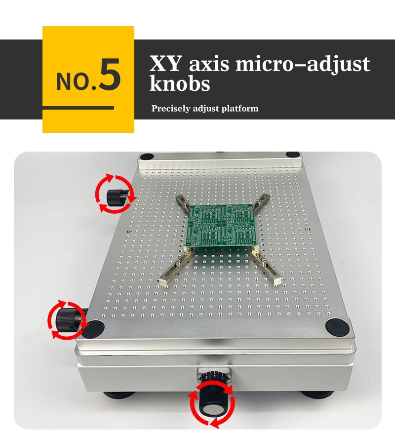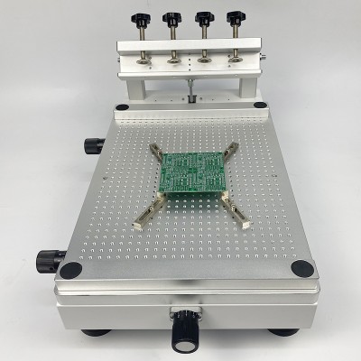 Step 2: according to the position of circuit board size and board components, placing the corresponding thimble between four positioning needle position, and adjust X and Y axis adjustment knob, the printing surface and hole of the printed circuit board printing template the precise positioning, through the locking knob fixed.