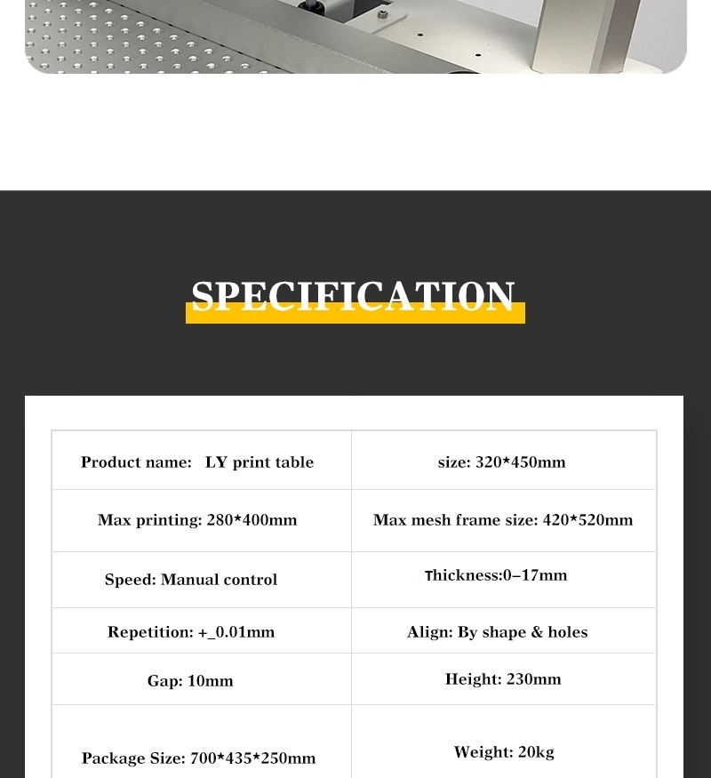The printing screen is fixed by 4 knob with pressure plate, and it is fast and firm