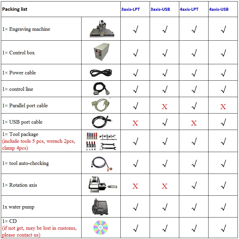 | Attribute | 3axis-LPT | 3axis-USB | 4axis-LPT | 4axis-USB |
