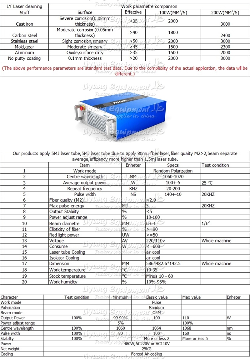 50W 100 w and 200 w laser pulse laser cleaning, using optical fiber output, fully enclosed stable light path, the service life of more than 100000 consecutive hours, 2 years warranty, forced air cooling, the machine integrated power 480 w, environmental protection and energy saving, small and portable.
