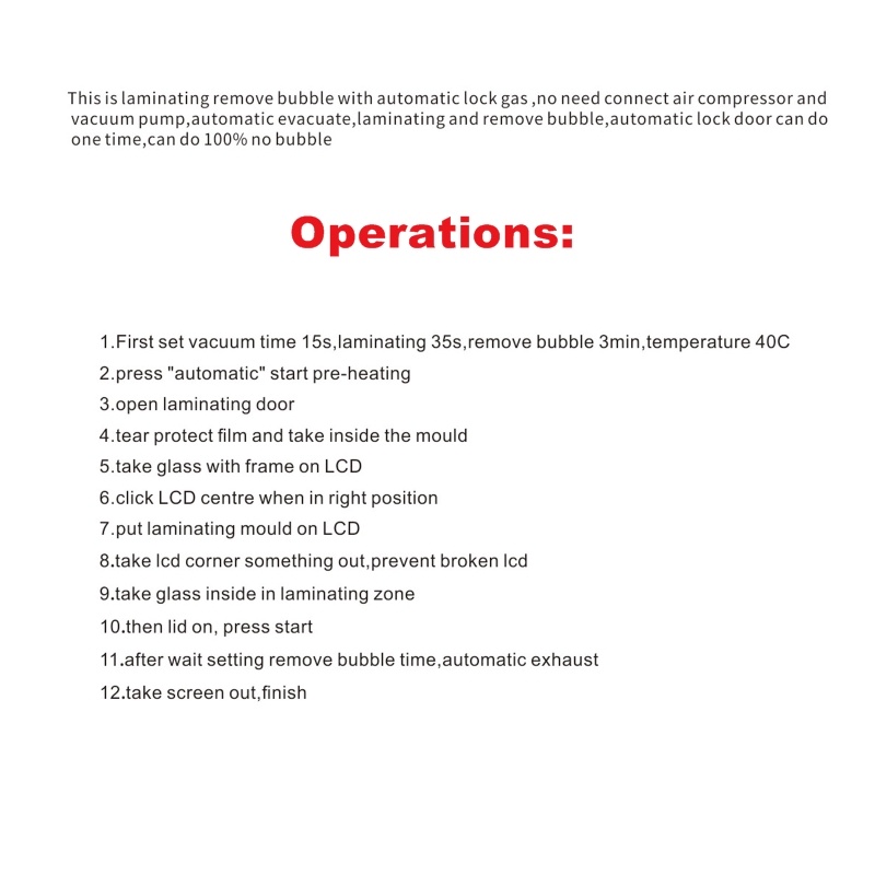 1.Directly plug to electricity to use,max laminate size 15 inch,debubble size 8 inch.