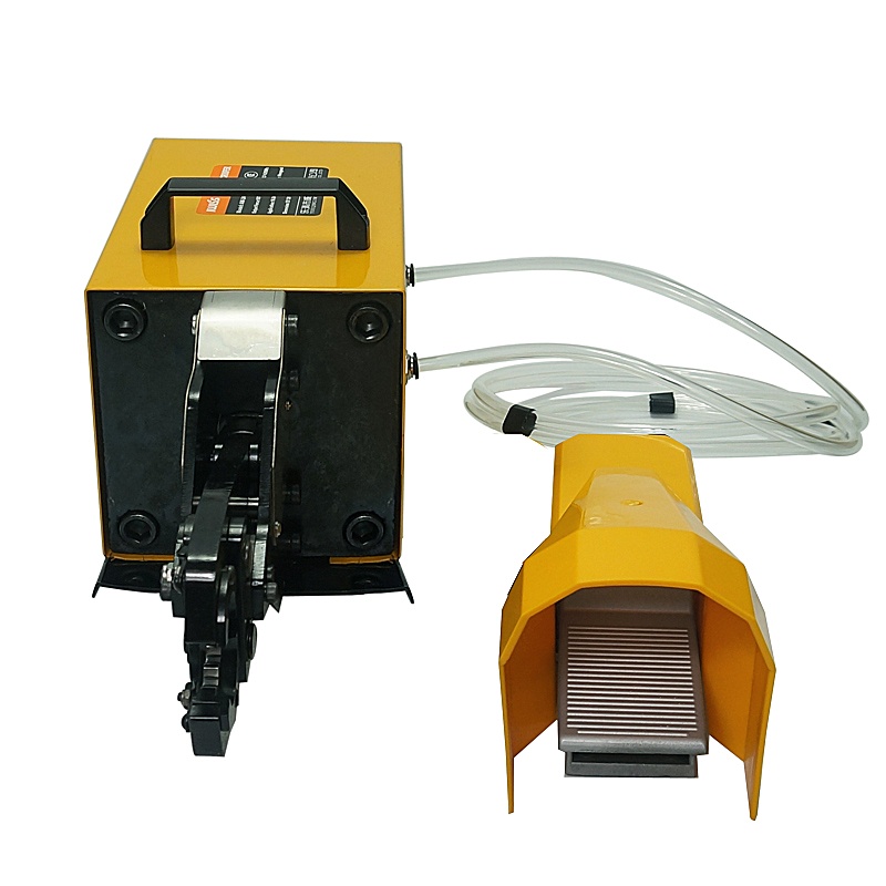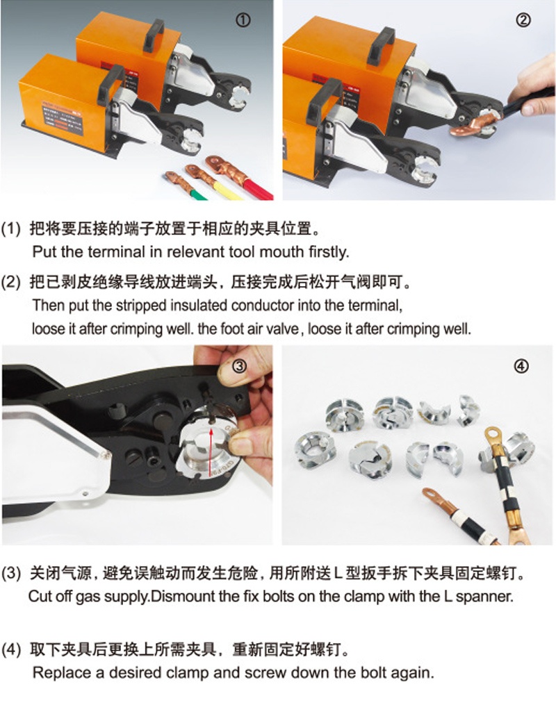 The machine is driven by dual-action normal cylinder, which has advantages of high effici-ency and quality in crimping force and speed. The machine is fit for crimping many kinds of terminals. The die sets are in terchangeable with our manual crimping tools. So we can provide you all kinds of die sets for crimping.
