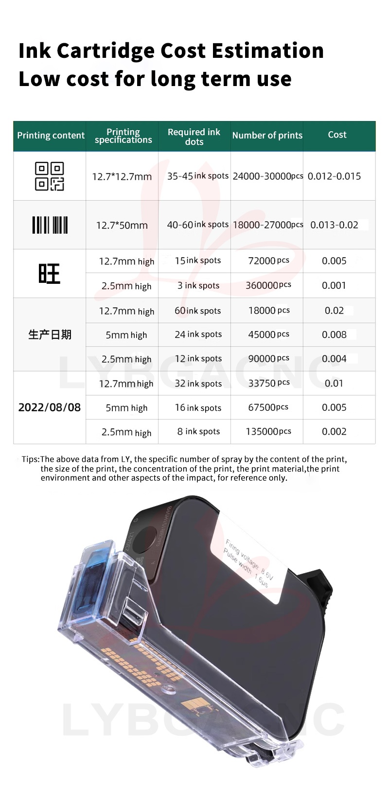 Printing type:English, Chinese, numeric, picture, barcode, QR code,codes, variable data, real time, expiration date