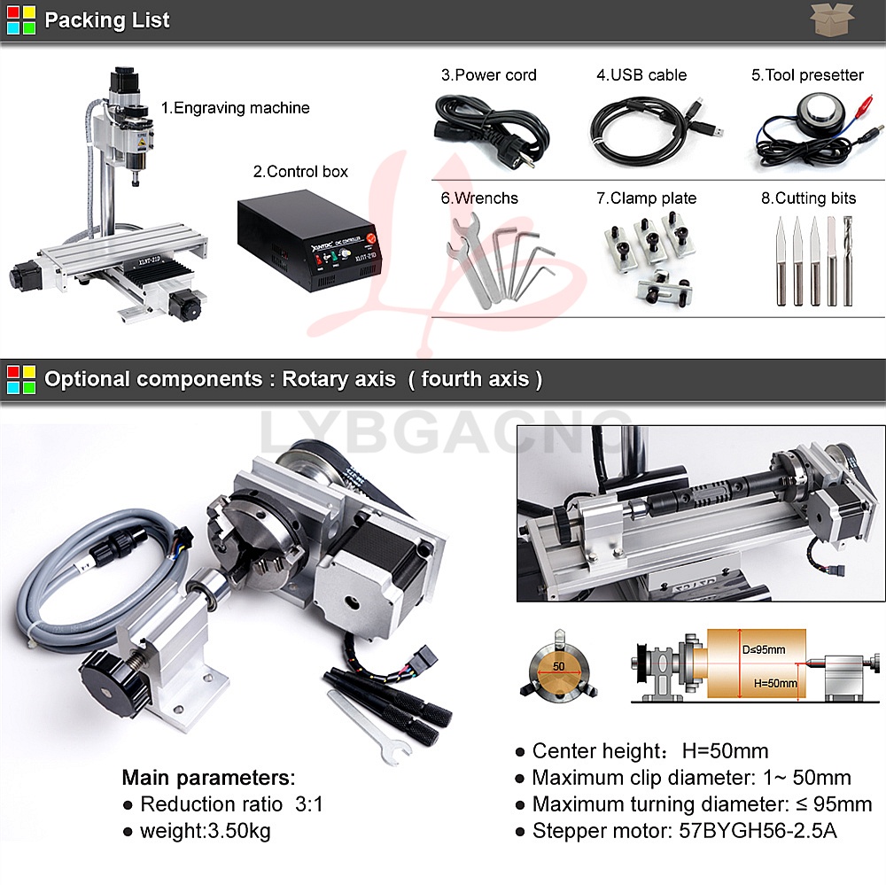 | Rotation Axis (4th Axis)Description: | Center height: H = 50mmMaximum turning diameter: ≤95mmDeceleration ratio: 3:1