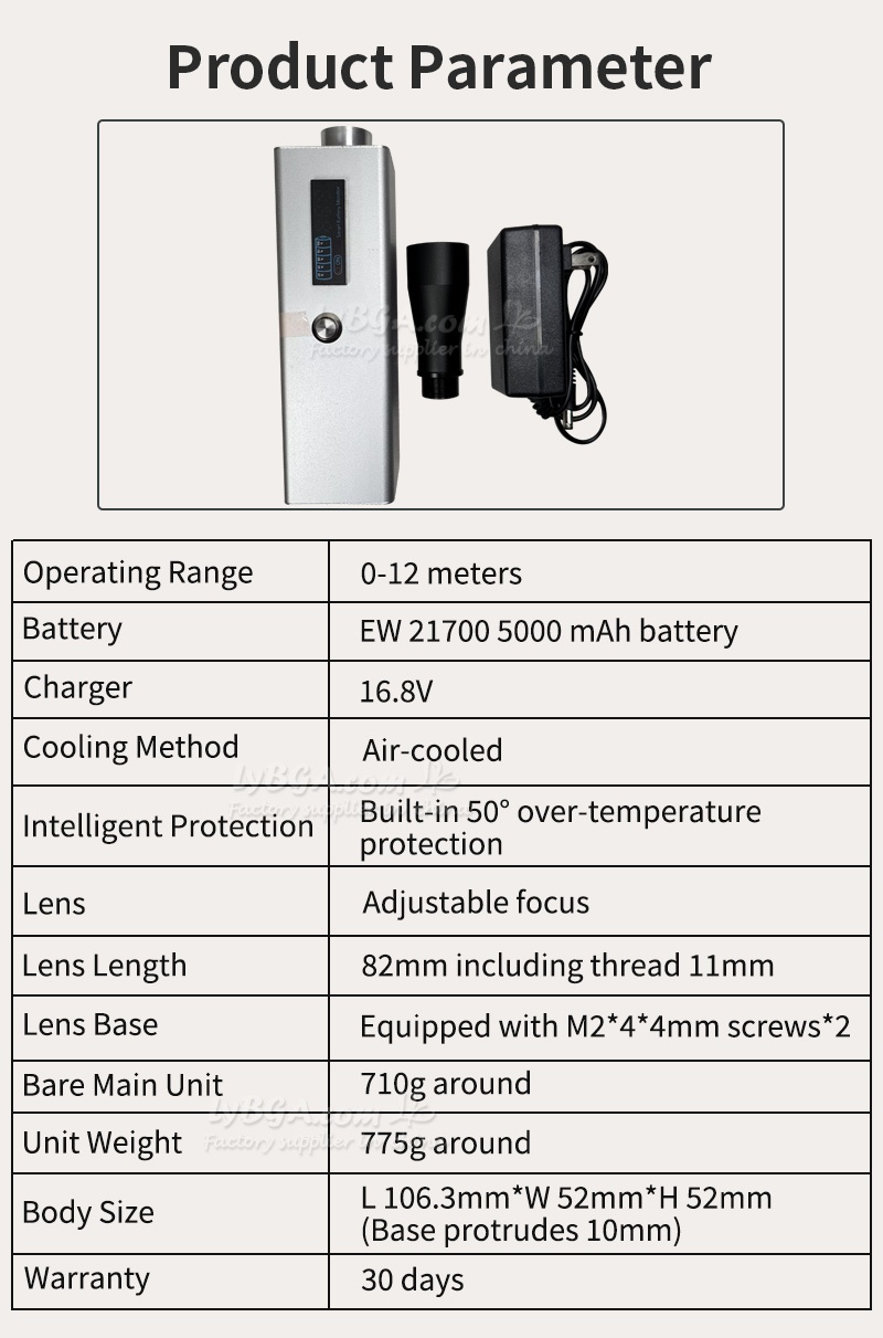 With the actual 10 meters (12 meters light spot can ignite the express carton) through the lens thread adjustable near and far, easy to operate, easy to control the equipment switch, adjustment and other functions.