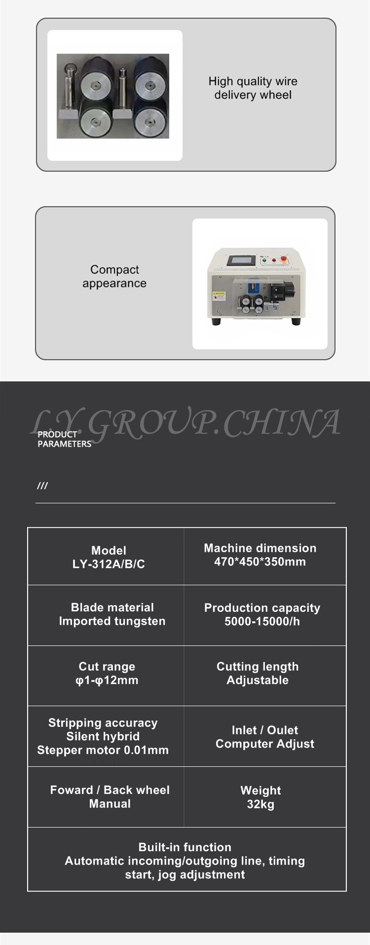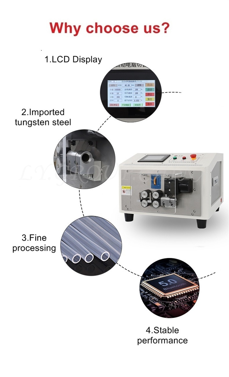 Our product is to use LCD screen man-machine dialogue mode, with nice appearance, simple operation, convenient maintenance, stable performance, speed, precision higher main features. Wire length can set arbitrary, thrum and the line end parameters can also according to the customer request to change, different degree of finish stripping wires, also has the high tension line of line, casing of the shear etc. Function