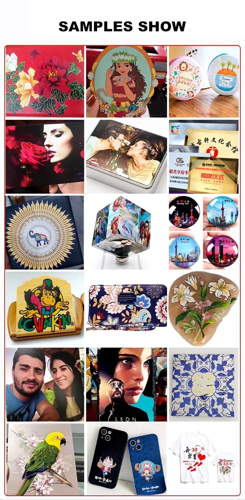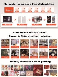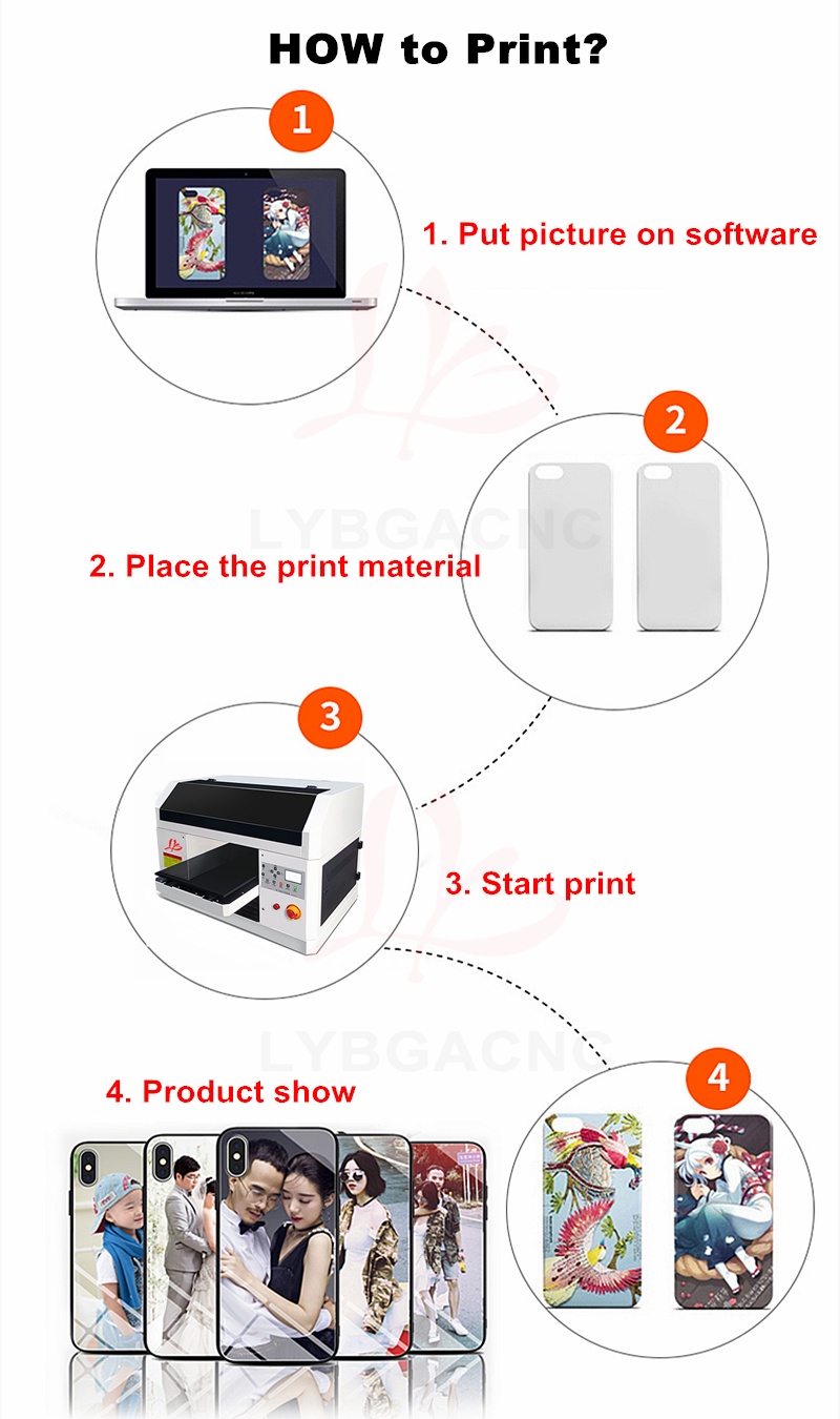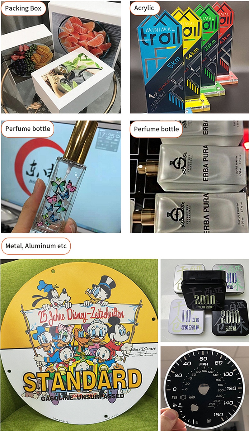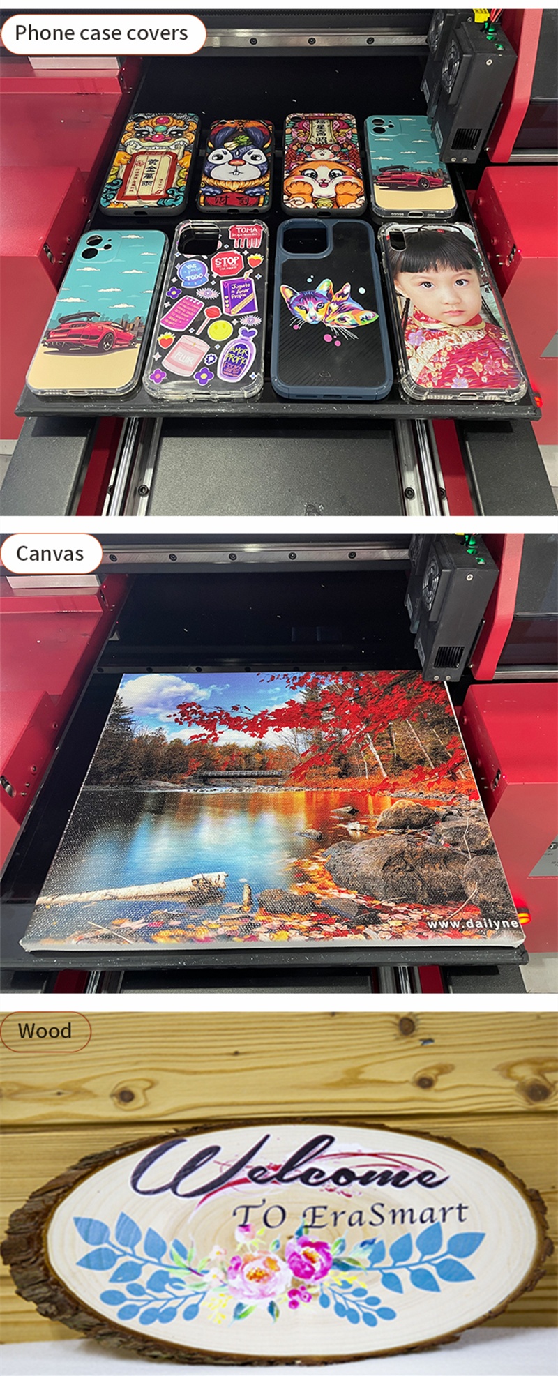 Automatic detect UV curing system, 6 colors and max 2880 dpi printing resolution. Can print on all kinds of surfaces, available in 3D textured and raised printing, suitable for printing on both rigid and flexible material, like phone cases, metal ( aluminum, copper etc ), alloys, mirror, gifts packaging (wood, carbon paper, metal), tablet cover, USB sticks, DVD disc, industry signs, badge, plastic card, PVC, glass, wood, paper etc.