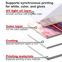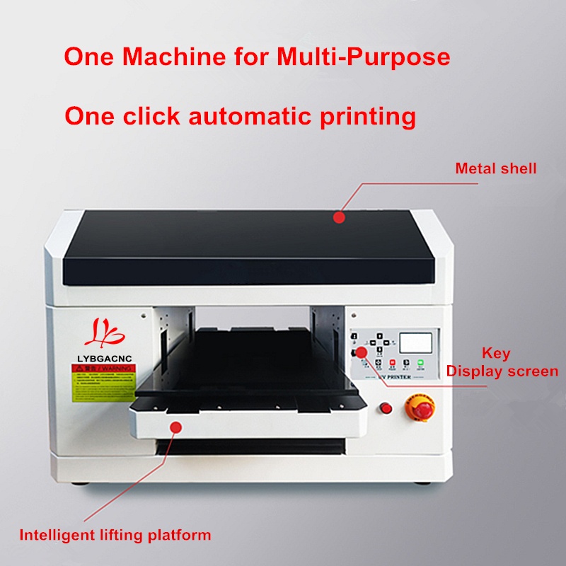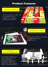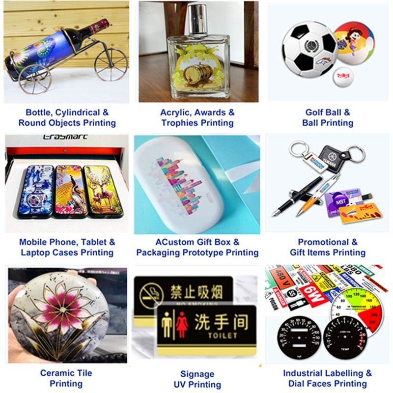 Automatic detect UV curing system, 6 colors and max 2880 dpi printing resolution. Can print on all kinds of surfaces, available in 3D textured and raised printing, suitable for printing on both rigid and flexible material, like phone cases, metal ( aluminum, copper etc ), alloys, mirror, gifts packaging (wood, carbon paper, metal), tablet cover, USB sticks, DVD disc, industry signs, badge, plastic card, PVC, glass, wood, paper etc.