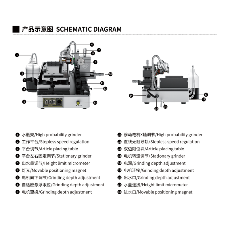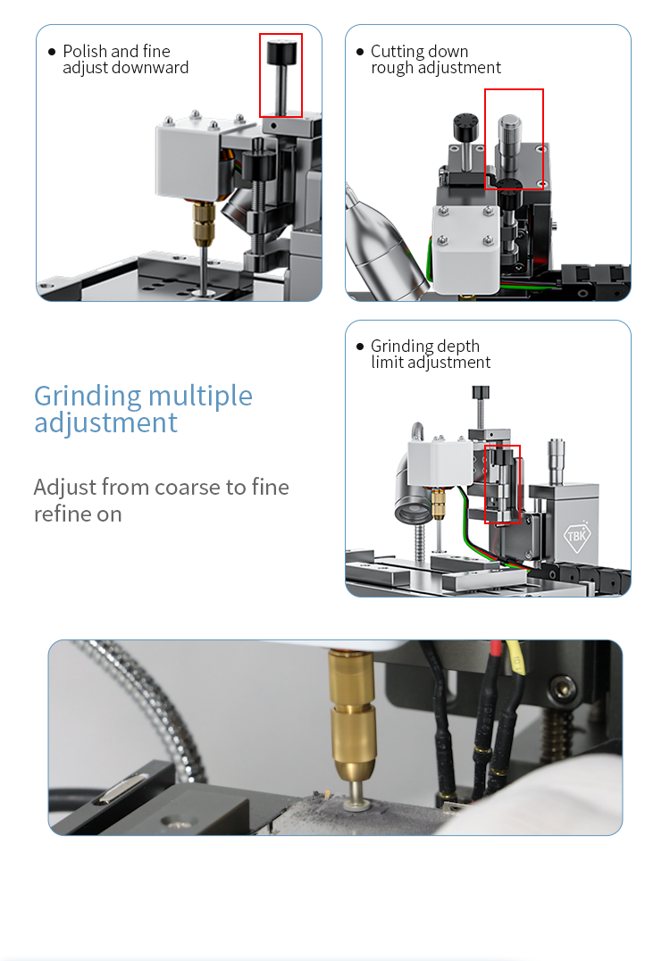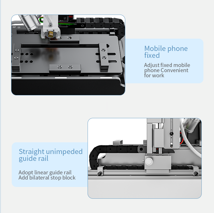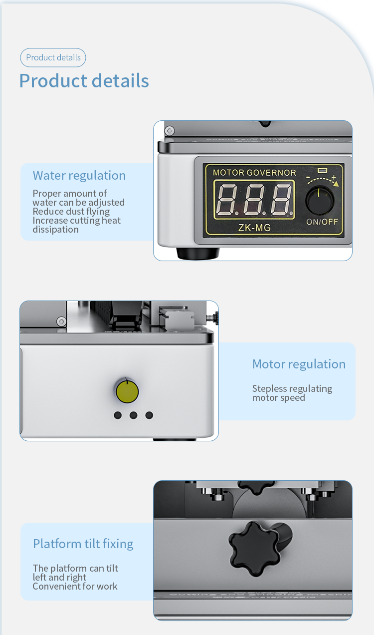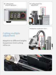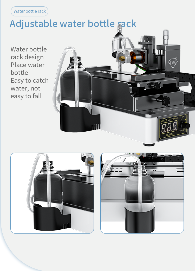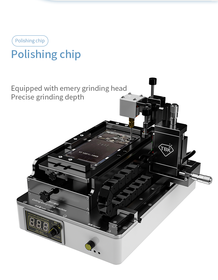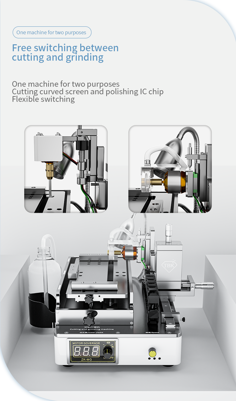 New intelligent cutting and grinding machine, (curved screen, straight screen) adaptive limit suspension cutting, cutting water design, reduce dust flying Increase cutting and heat dissipation, polish the mobile phone cable IC, motherboard IC, camera frame and back cover glass. Multi directional adjustment and control, linear unimpeded guide rail Add bilateral limit blocks, aviation brushless motor, powerful, one machine, simple operation, good helper for maintaining mobile phones!