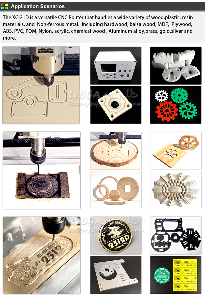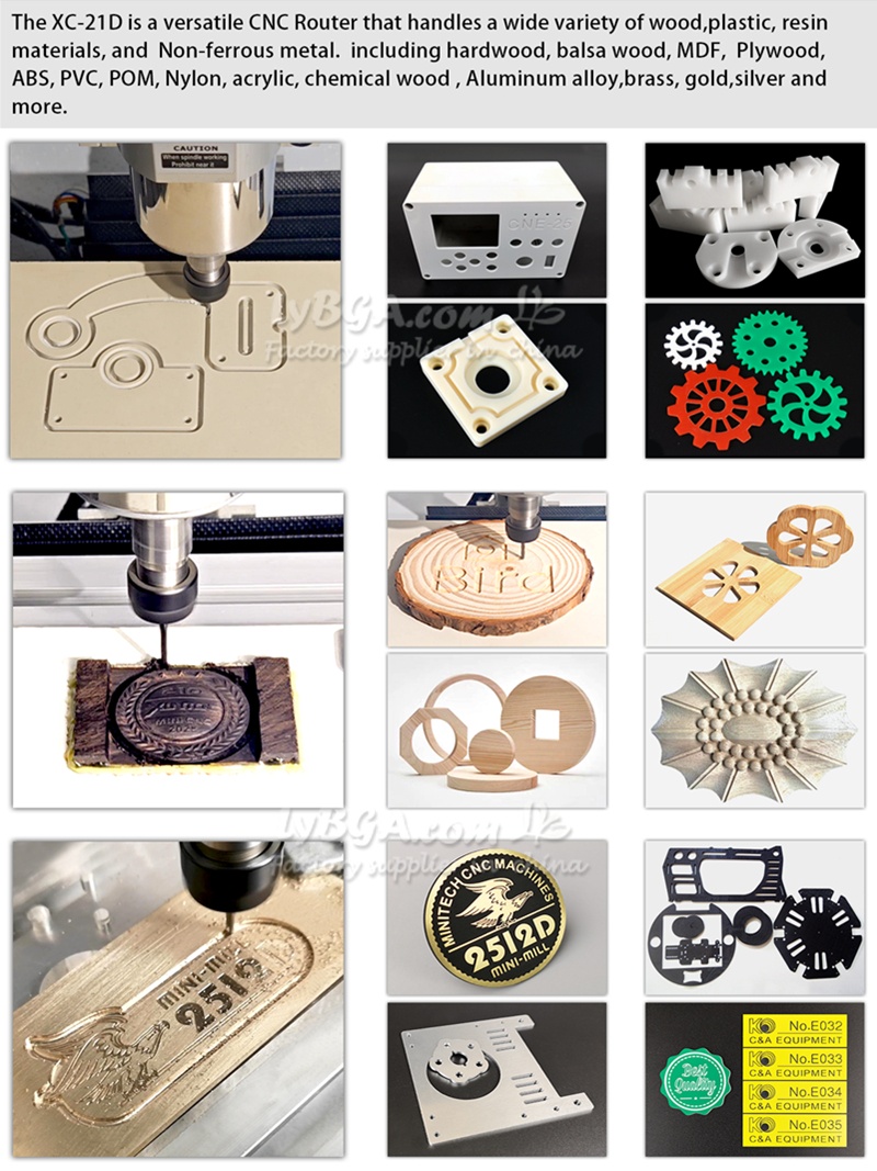 The XC-21D is a versatile CNC Router that handles a wide variety of wood, plastic, resin materials, and Non-ferrous metal. including hardwood, balsa wood, MDF, Plywood, ABS, PVC, POM, Nylon, acrylic, chemical wood,Aluminum alloy, brass, gold, silver and more. .