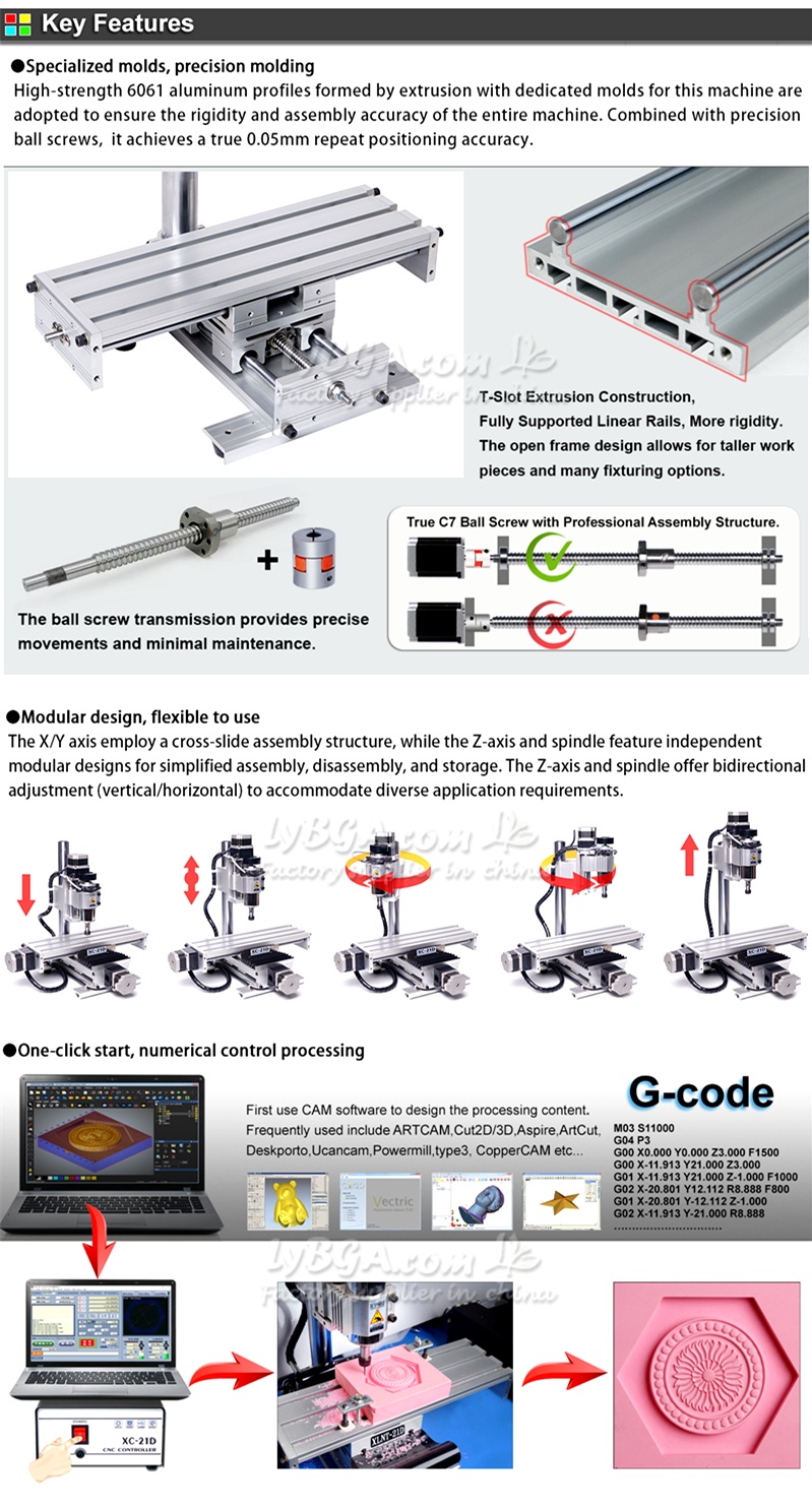 The X/Y axis employ a cross-slide assembly structure, while the Z-axis and spindle feature independent modular designs for simplified assembly, disassembly, and storage. The Z-axis and spindle offer bidirectional adjustment (vertical/horizontal) to accommodate diverse application requirements.