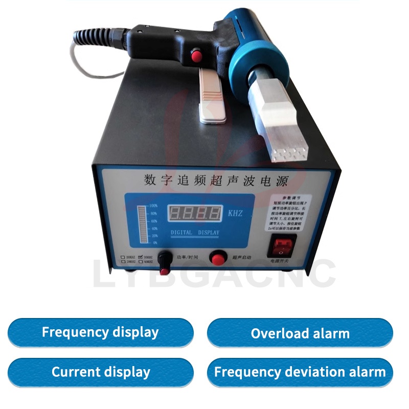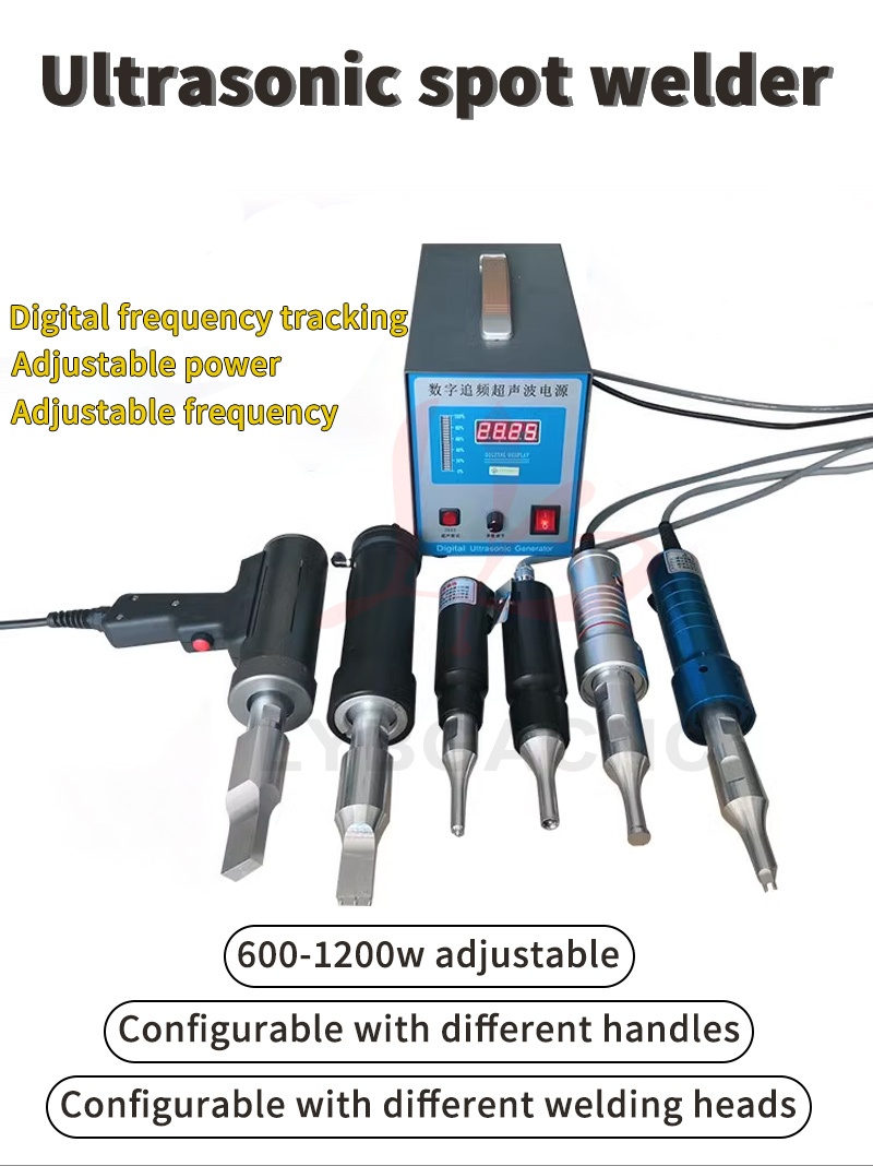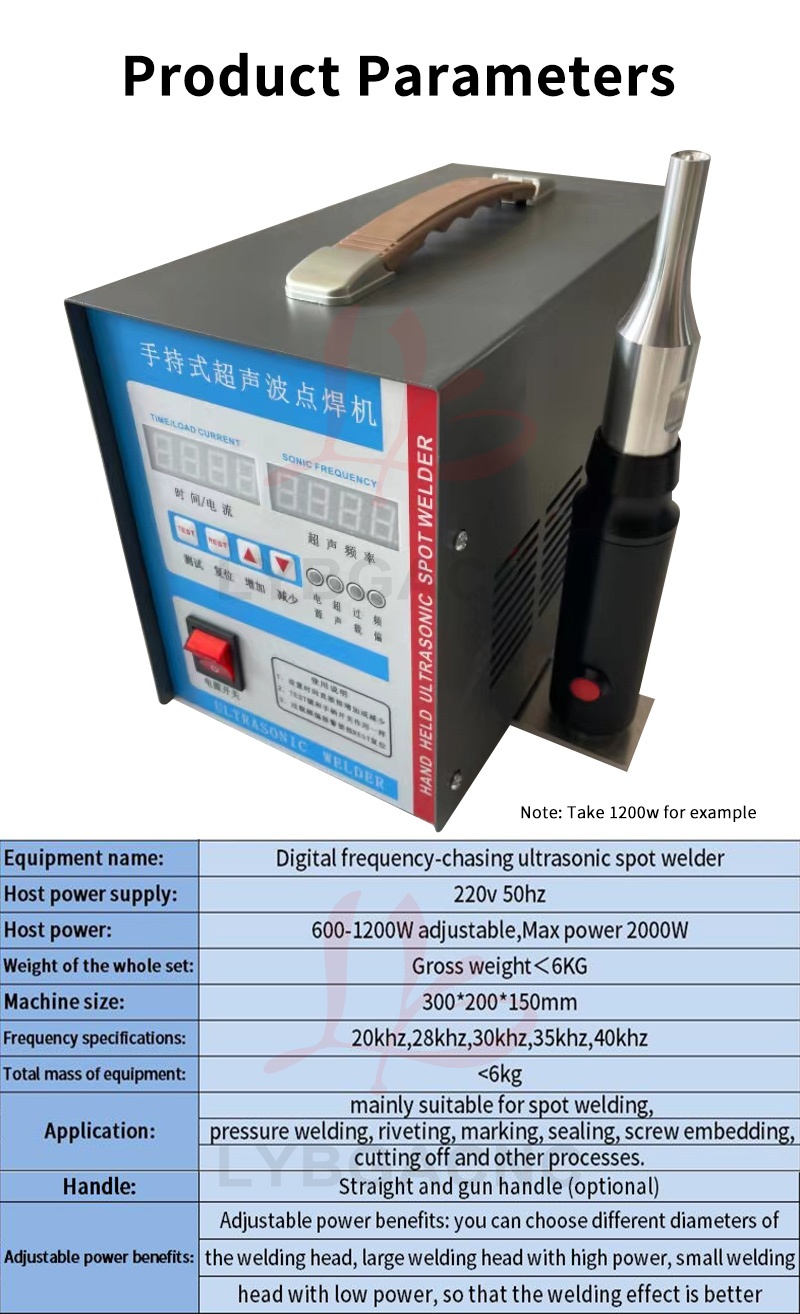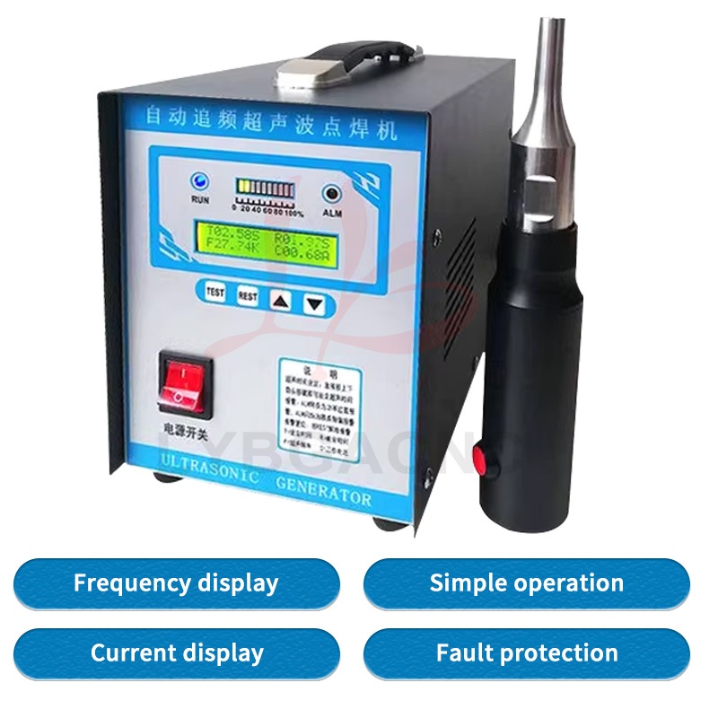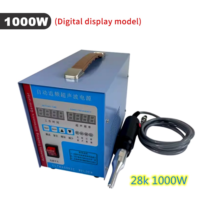 Product parameters Equipment Name: Ultrasonic Plastic Welding Machine Equipment power: 600W-1500W Equipment frequency: 20、28、30、35、40khz Equipment volume: 300 * 200 * 150mm Equipment quality: 6kg Output power: 600W-1500W Power form: Ultrasound Current: AC Frequency band: high frequency Control method: manual Drive form: manual (Please note the welding items) Applications: car modification, shoulder strap weaving, underwear wigs, leather fabrics, chicken manure straps, etc   Product features 1. Easy and fast to operate, can be used after connecting to a 220V power supply; 2. Pure physical vibration, no radiation and corrosion, no harm to human body; 3. Compact in size, 5kg light in weight, comes with a handle for easy carrying; 4. The power supply adopts an automatic frequency tracking method, with a frequency tracking accuracy of up to 1Hz; 5. Stable amplitude can achieve ideal welding effect, and power can be adjusted; 6. You can manually set the upper and lower frequency limits, with a range of up to 1.2 kHz. 7. The use of transducers produced by large factories has a longer lifespan, lightweight handles, and convenient portability. 8. The driving power supply adopts a modular integrated circuit, with four high current IGBT power transistors providing strong output. 9. Built in fully automatic protection circuit, multiple protections, safe use, stable and reliable operation. 10. Built in soft start function to protect large molds from impact   Usage: Mainly suitable for spot welding, pressure welding, riveting, marking, sealing, screw embedding, cutting and other processes. Spot welding machines are suitable for plastic materials such as ABS, PP, PE, PC, PUC, PMMA, PS, PPS, PBT, PETG, etc; It is also used in plastics, electronics, electrical appliances, automotive accessories, packaging, medical, non-woven clothing, stationery and daily necessities, plastic toys, fecal cleaning belts, bumpers, sound insulation cotton, waterproof boards, non-woven masks, film, pen boxes, fishing rod boxes, animal husbandry, non-woven fabrics, inner diameter shoulder straps, underwear, wigs, film, shoe materials, and so on.