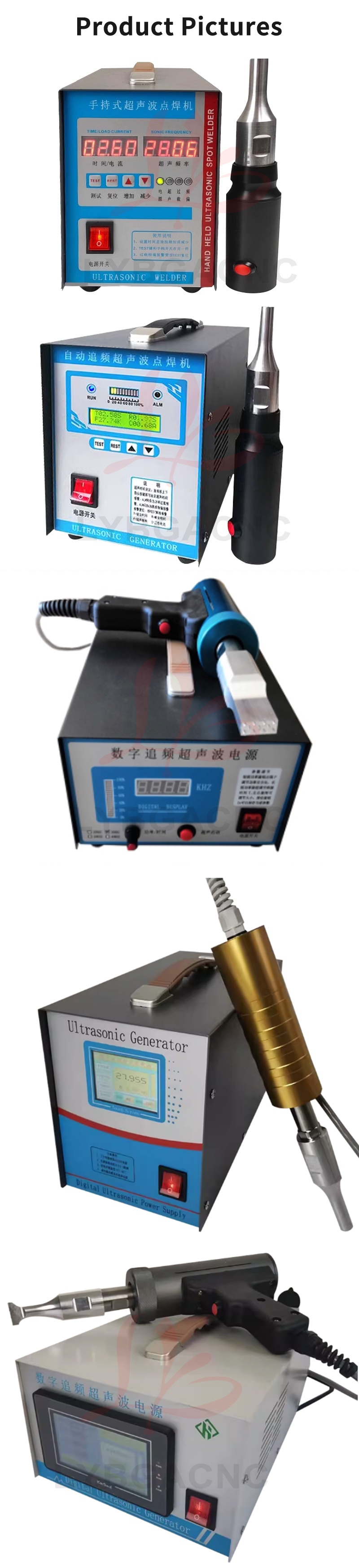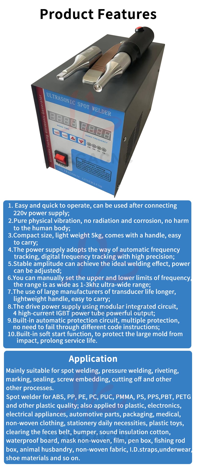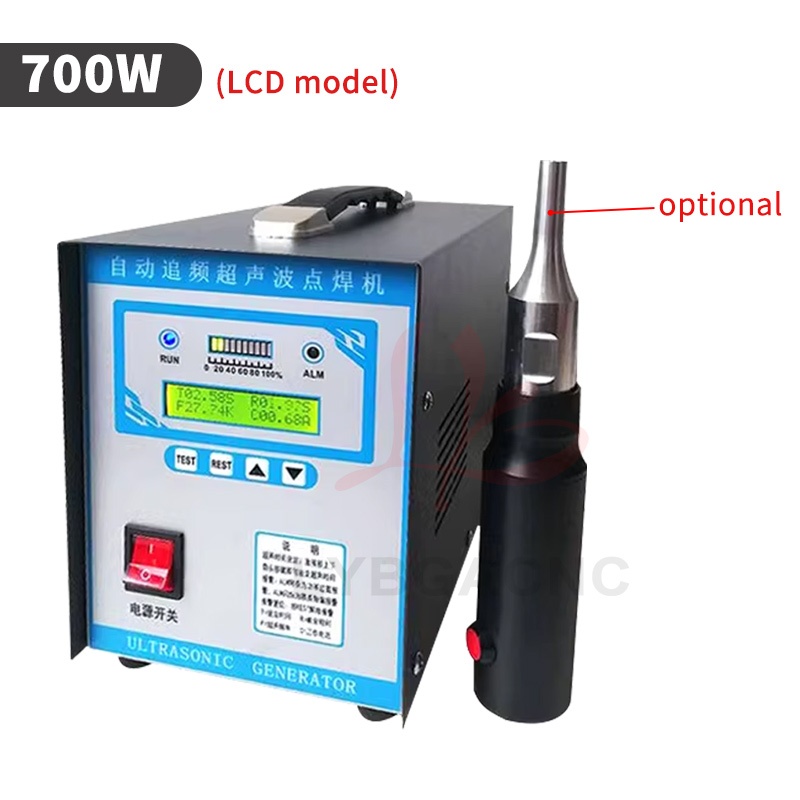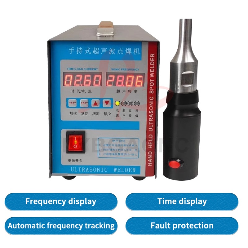 Product parameters Equipment Name: Ultrasonic Plastic Welding Machine Equipment power: 600W-1500W Equipment frequency: 20、28、30、35、40khz Equipment volume: 300 * 200 * 150mm Equipment quality: 6kg Output power: 600W-1500W Power form: Ultrasound Current: AC Frequency band: high frequency Control method: manual Drive form: manual (Please note the welding items) Applications: car modification, shoulder strap weaving, underwear wigs, leather fabrics, chicken manure straps, etc   Product features 1. Easy and fast to operate, can be used after connecting to a 220V power supply; 2. Pure physical vibration, no radiation and corrosion, no harm to human body; 3. Compact in size, 5kg light in weight, comes with a handle for easy carrying; 4. The power supply adopts an automatic frequency tracking method, with a frequency tracking accuracy of up to 1Hz; 5. Stable amplitude can achieve ideal welding effect, and power can be adjusted; 6. You can manually set the upper and lower frequency limits, with a range of up to 1.2 kHz. 7. The use of transducers produced by large factories has a longer lifespan, lightweight handles, and convenient portability. 8. The driving power supply adopts a modular integrated circuit, with four high current IGBT power transistors providing strong output. 9. Built in fully automatic protection circuit, multiple protections, safe use, stable and reliable operation. 10. Built in soft start function to protect large molds from impact   Usage: Mainly suitable for spot welding, pressure welding, riveting, marking, sealing, screw embedding, cutting and other processes. Spot welding machines are suitable for plastic materials such as ABS, PP, PE, PC, PUC, PMMA, PS, PPS, PBT, PETG, etc; It is also used in plastics, electronics, electrical appliances, automotive accessories, packaging, medical, non-woven clothing, stationery and daily necessities, plastic toys, fecal cleaning belts, bumpers, sound insulation cotton, waterproof boards, non-woven masks, film, pen boxes, fishing rod boxes, animal husbandry, non-woven fabrics, inner diameter shoulder straps, underwear, wigs, film, shoe materials, and so on.