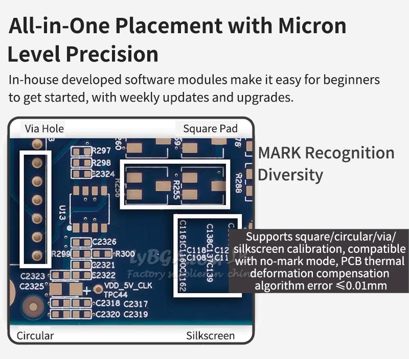 Supports square/circular/via/silkscreen calibration, compatible with no-mark mode, PCB thermal deformation compensation algorithm error ≤0.01mm