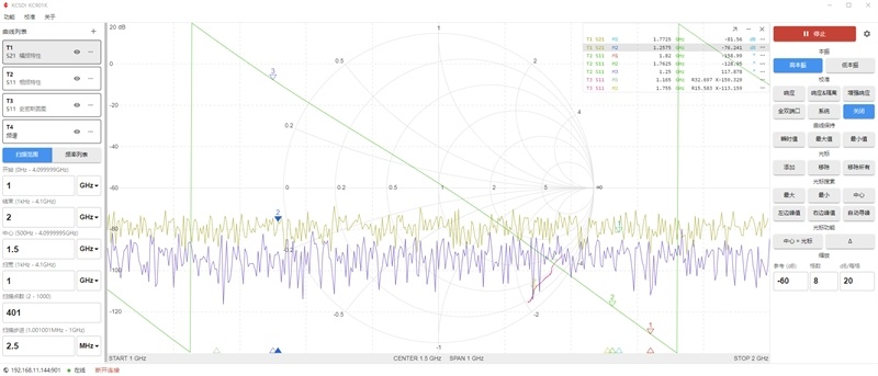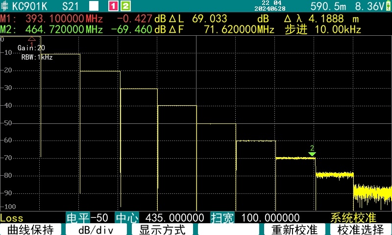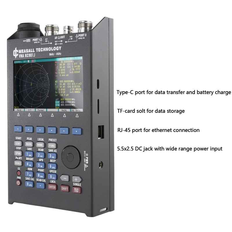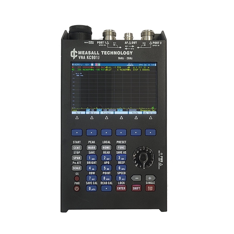 KC901J is a multipurpose RF instrument integrating a Network Analyzer, spectrum analyzer, field strength meter, and a signal generator. It can measure the level and phase change of signals through the device under test.