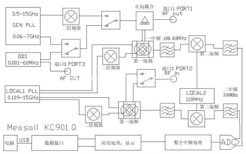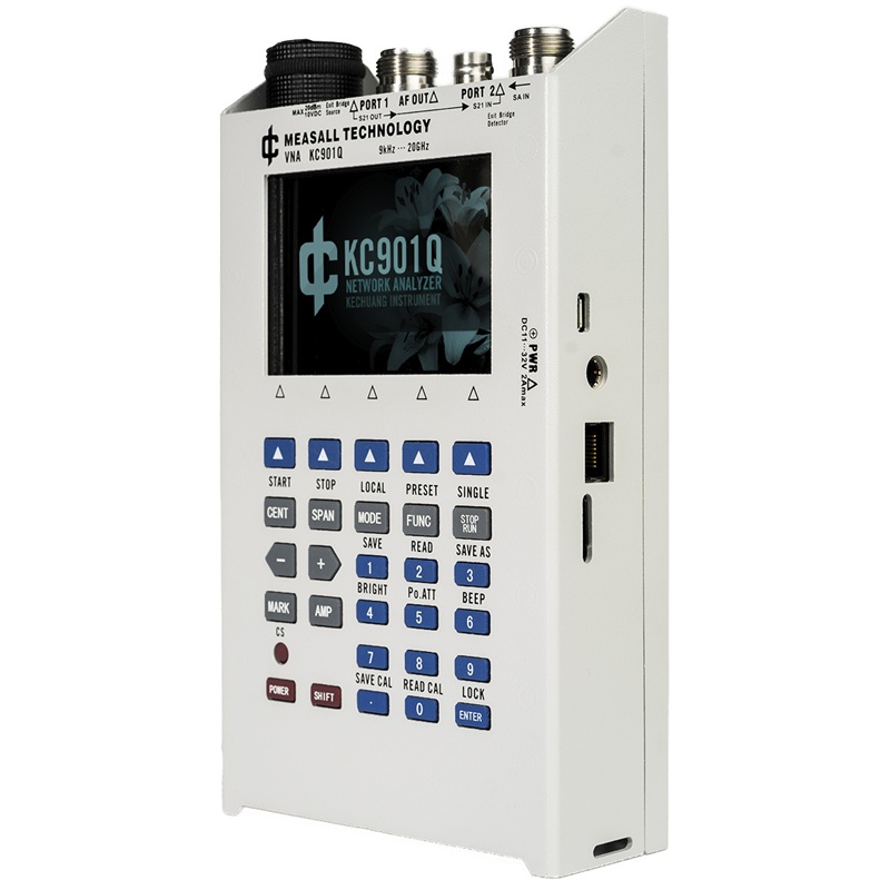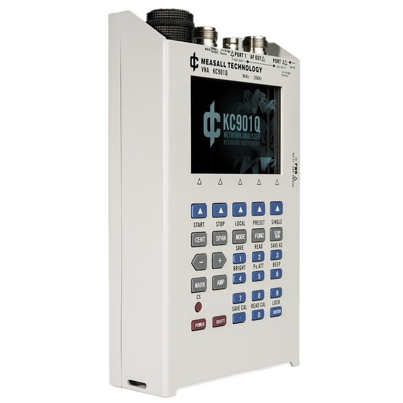 KC901Q is a multipurpose RF instrument integrating a Network Analyzer, spectrum analyzer, field strength meter, and a signal generator. It can measure the level and phase change of signals through the device under test.